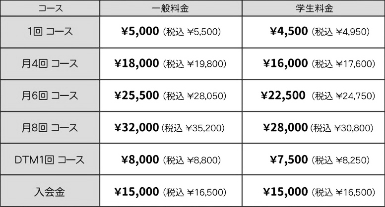 一切ございません。当スクールの機材を使用しますので、手ぶらで受講していただいて問題ございません。( プレイしたい曲などの持ち込みはもちろん歓迎いたします。 ) また、機材をお持ちでなくても当スクールの機材で練習ができるよう、個人練習プランもご用意しています。